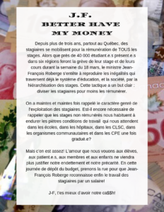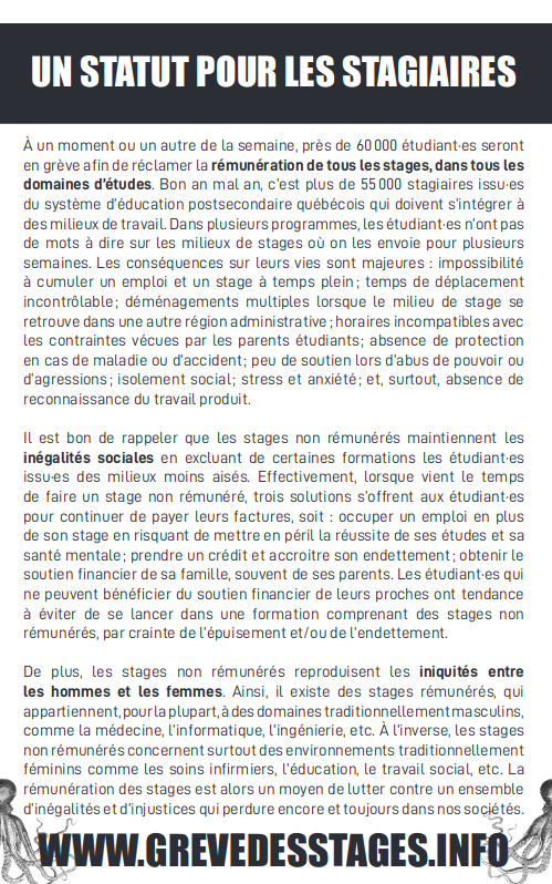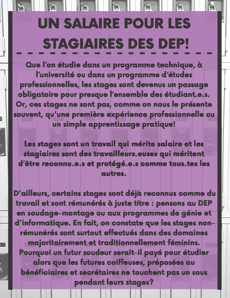 TRACT | Mobilisation des stagiaires des DEP (diplômes d’études professionnelles); imprimer 2 pages sur 1 feuille (81/2 x 11) pour obtenir 2 tracts recto-verso